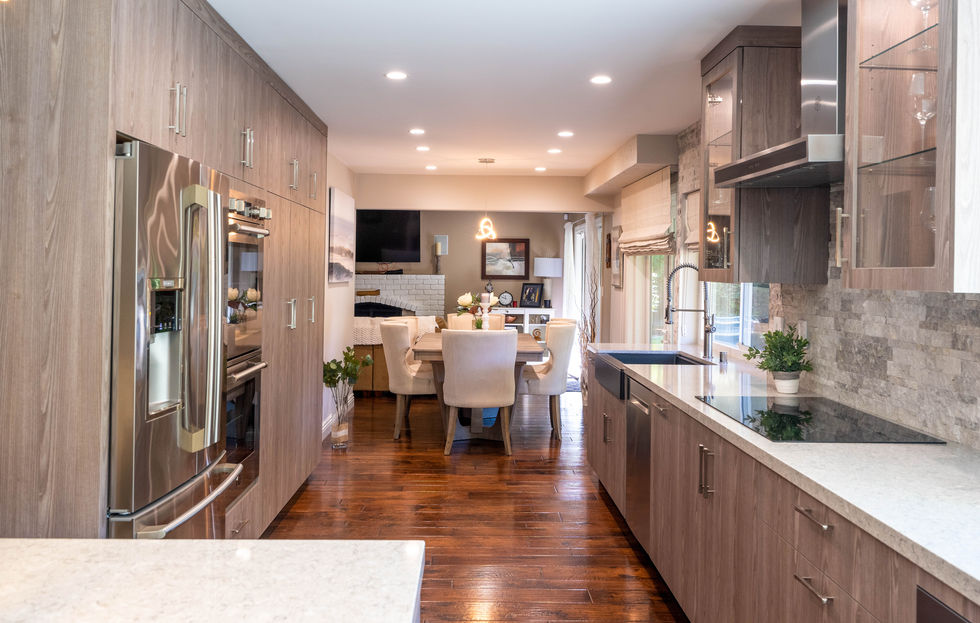 The homeowners, originally from Ireland, sought to modernize their kitchen while maintaining a touch of traditional style. After some initial hesitation, they placed their trust in our process, resulting in a stunning transformation. The kitchen now features a large island in what was once the dining room area, providing ample space for both meal preparation and dining. Our interior design team carefully selected materials and accompanied the clients to showrooms to develop the perfect 3D designs.